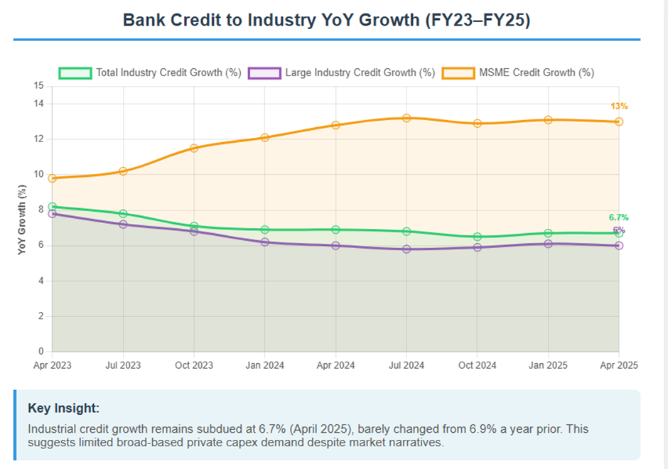 At the same time, bank credit growth to industry, a strong proxy for capex deployment, was 6.7% as of April 2025, largely unchanged from the 6.9% figure a year prior. Lending to large industries grew just ~6% YoY, with the stronger momentum observed in MSMEs (13% YoY growth), according to RBI data.
