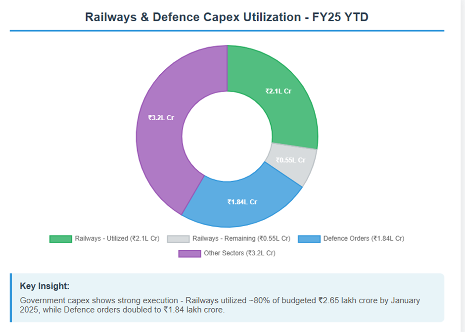 - Railways: Of the ₹2.65 lakh crore capital outlay for FY25, ₹2.1 lakh crore (~80%) was utilized by January, spent on track doubling, electrification, 1,300+ station upgrades, and Vande Bharat trains.