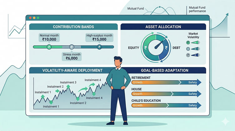 Instead of one fixed SIP amount forever, investors will likely use contribution bands. Normal month: ₹10,000. Stress month: ₹6,000. High-surplus month: ₹15,000, but only if liquidity goals are already funded. The system will stop treating every month as equally investable.